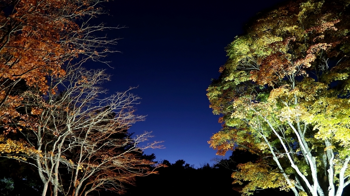 赤や黄色の木々がライトの柔らかな光に照らされて、妖しげなトンネルを作り出す。