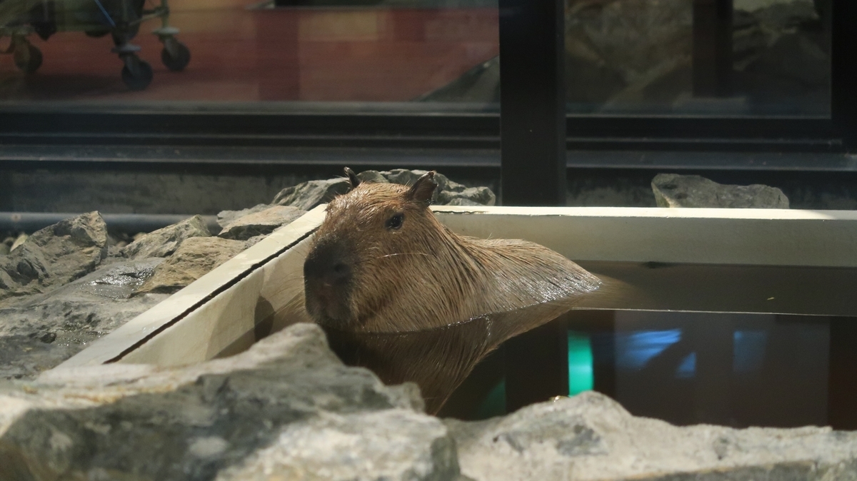 こちらのカピパラさんのお風呂は、お食事のみだと見れない場所(たぶん)。気持ちよさそうな姿を見るには、宿泊か日帰り入浴が必須だと思う。